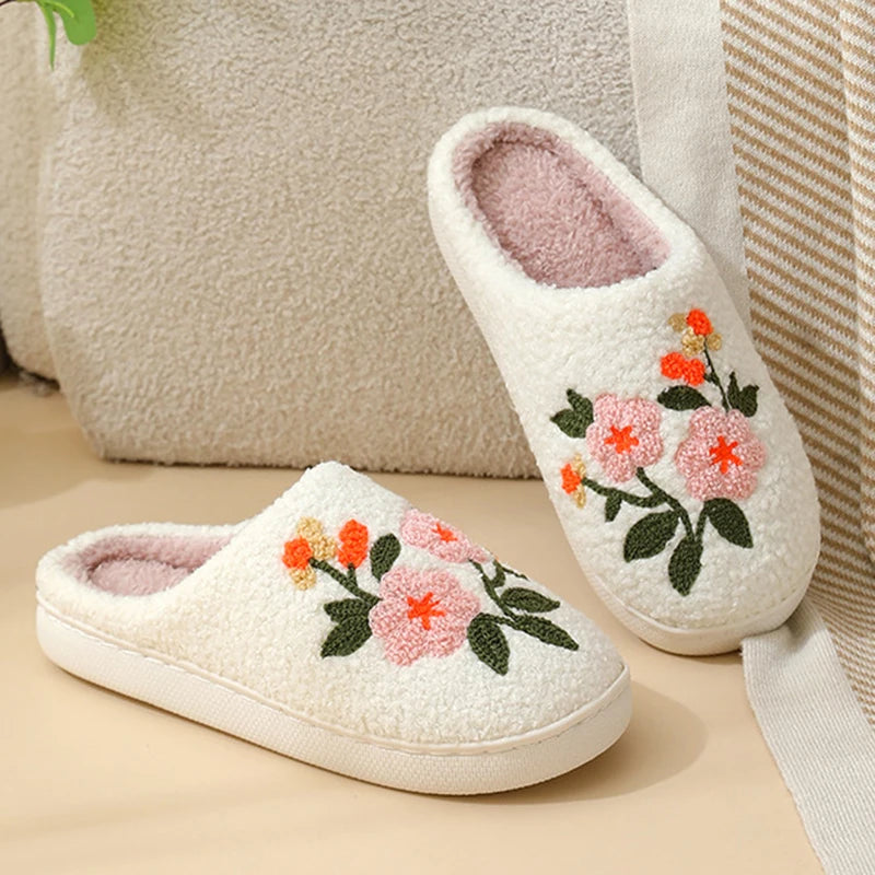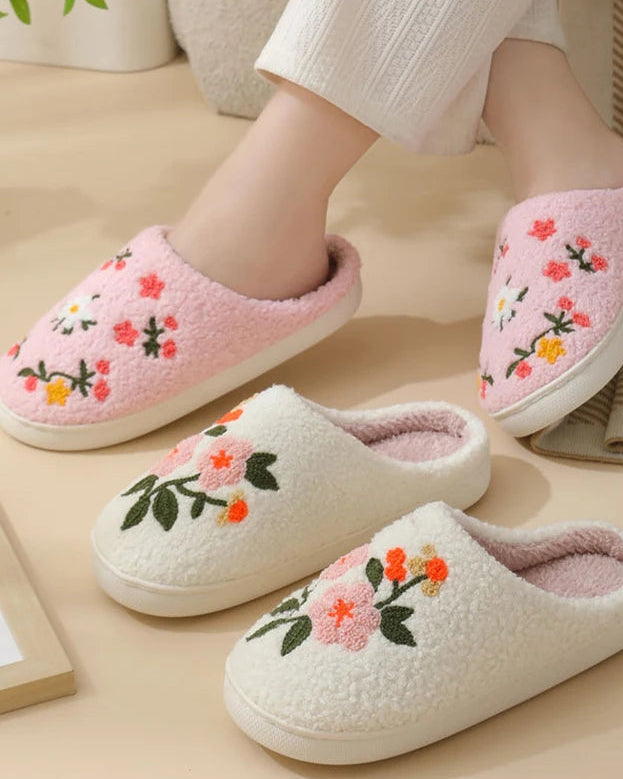 Chaussons d’intérieur ultra-doux en coton décorés de fleurs brodées, doublés en peluche courte pour un confort chaud et léger au quotidien.